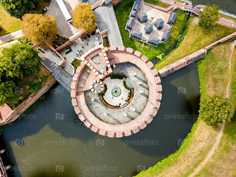 Россия, Калининград. Аэрофотосъемка. Крепостная башня середины девятнадцатого века. Расположен в центре Калининграда на берегу Верхнего озера. ВЫСТРЕЛ В ГОЛОВУ