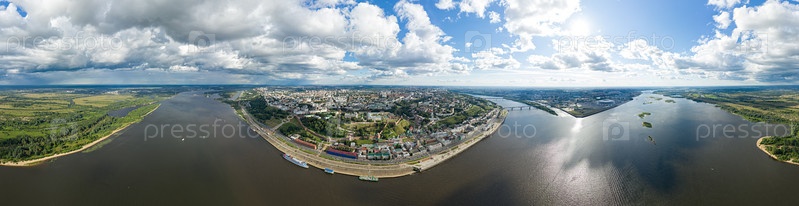 Нижний Новгород, Россия. Панорама 360 города с видом на Кремль. Стрелка. Место слияния рек Оки и Волги. С высоты птичьего полета