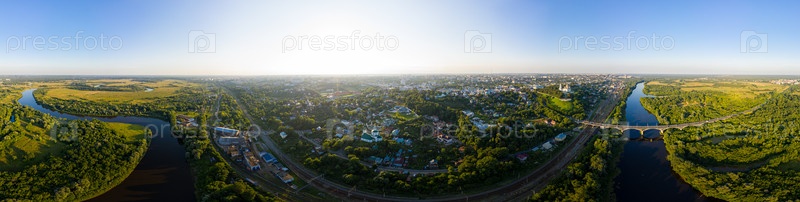 Россия, Владимир. Панорама 360 центра города, река Клязьма с мостом