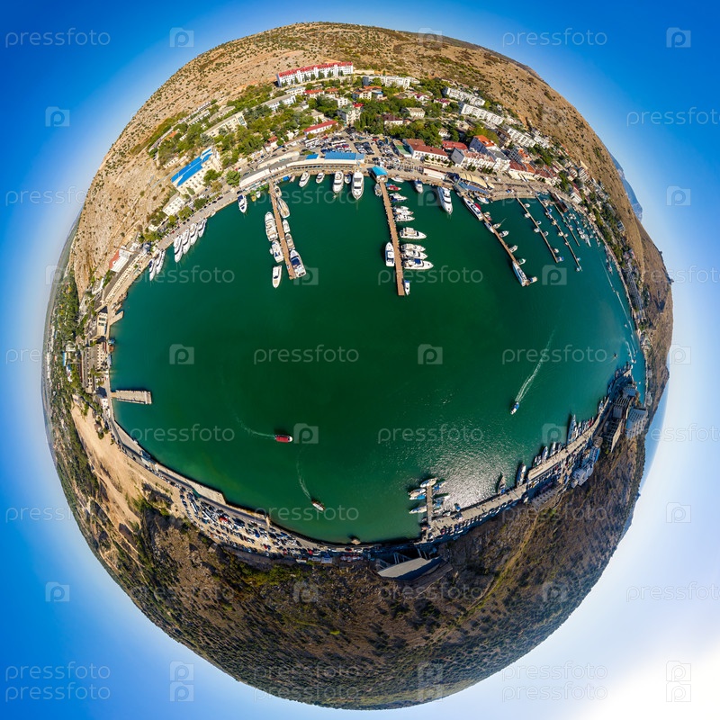 Севастополь, Крым. Балаклавская бухта с яхтами и прогулочными катерами. С высоты птичьего полета. 360-градусный панорамный астероид