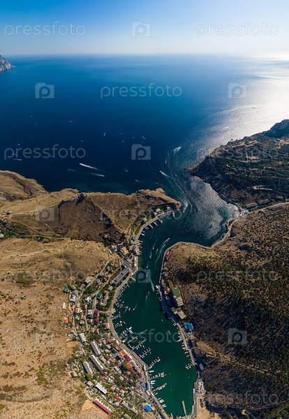 Севастополь, Крым. Балаклавская бухта с яхтами и прогулочными катерами. С высоты птичьего полета