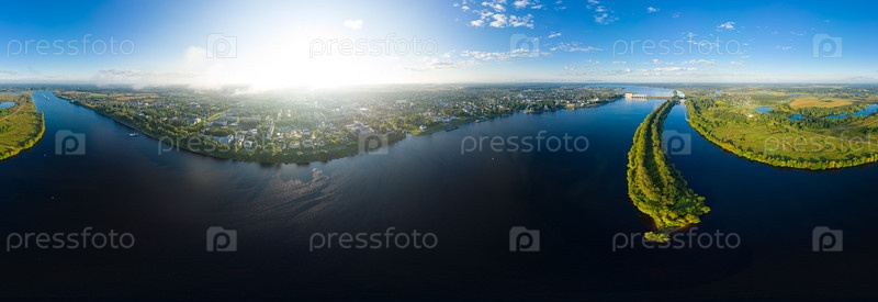Углич, Россия. Панорама набережной реки Волги, Угличская ГЭС, Шлюз. Панорама 360