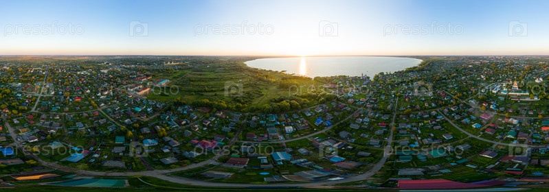 Переславль-Залесский, Россия. Плещеево озеро во время заката. Панорама 360. Вид с воздуха