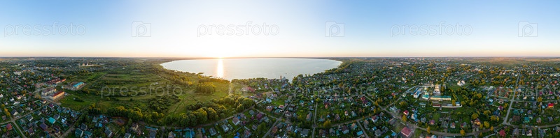 Переславль-Залесский, Россия. Плещеево озеро во время заката. Панорама 360. Вид с воздуха