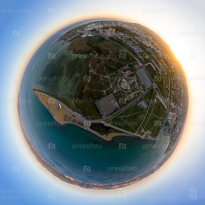 Новороссийск, Россия. Центральная часть города. Суджукская коса. Закат. 360-градусный панорамный астероид