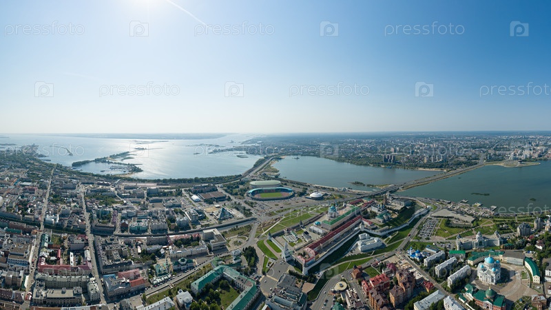 Казань, Россия. Панорама центральной части города, вид на слияние рек Волги и Казанки. С высоты птичьего полета