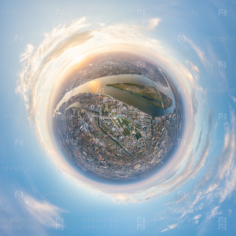 Астрахань, Россия. Панорама города с воздуха летом. Река Волга и остров Городстой. Время заката. 360-градусный воздушный панорамный астероид