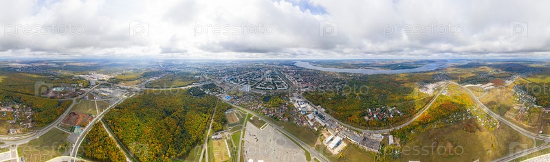 Самара. Россия. Осенний пейзаж. Вид с воздуха на город Самара. Много облаков в небе