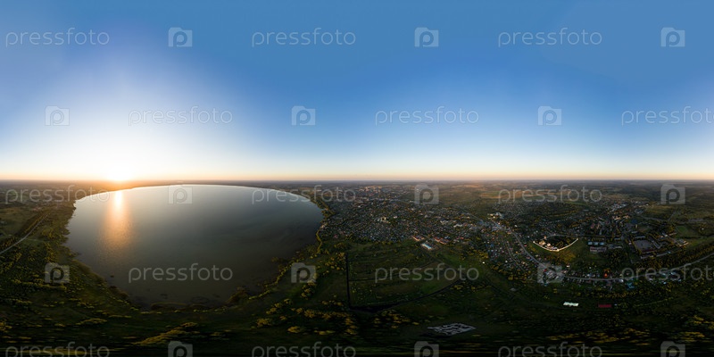 Переславль-Залесский, Россия. Плещеево озеро во время заката. Панорама 360. Вид с воздуха