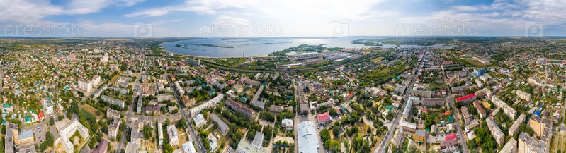Сызрань, Россия. Аэрофотоснимок центральной части города. Вид на Волгу. Панорама 360