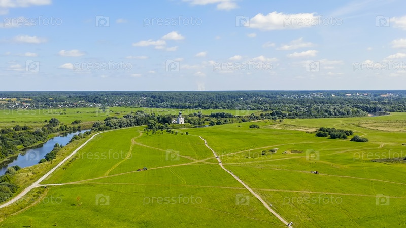 Россия, Боголюбово. Вид с воздуха на церковь Покрова на Нерли. Православная церковь и символ средневековой России, вид с воздуха