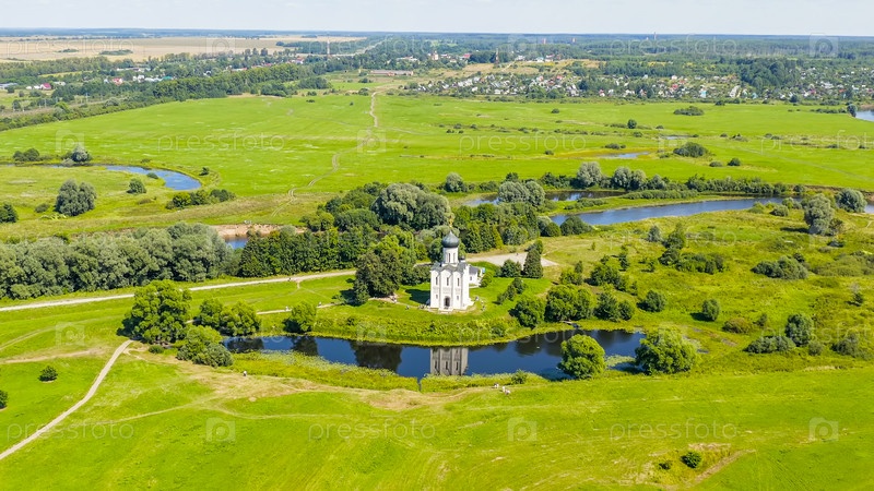 Россия, Боголюбово. Вид с воздуха на церковь Покрова на Нерли. Православная церковь и символ средневековой России, вид с воздуха