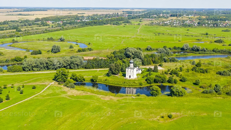 Россия, Боголюбово. Вид с воздуха на церковь Покрова на Нерли. Православная церковь и символ средневековой России, вид с воздуха