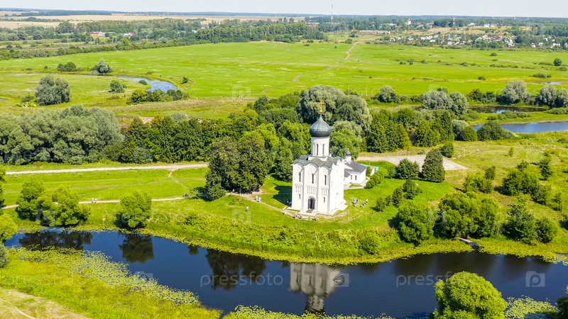 Россия, Боголюбово. Вид с воздуха на церковь Покрова на Нерли. Православная церковь и символ средневековой России, вид с воздуха