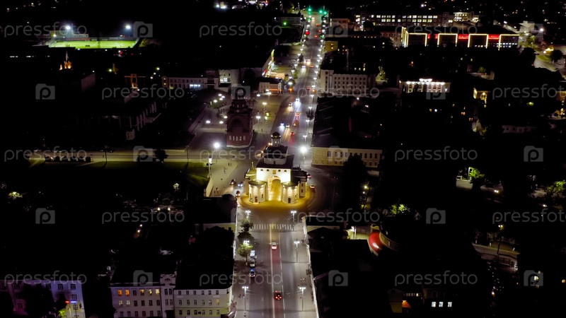Россия, Владимир. Ночной город с воздуха. Золотые ворота (Владимир), вид с воздуха