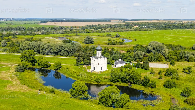 Россия, Боголюбово. Вид с воздуха на церковь Покрова на Нерли. Православная церковь и символ средневековой России, вид с воздуха
