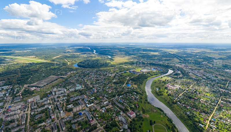 Ржев, Россия. Панорама центра города. Вид с воздуха на Волгу и набережную