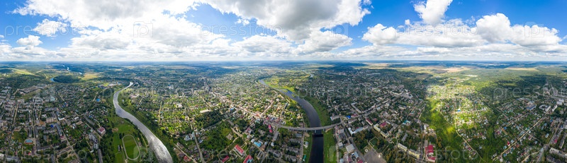 Ржев, Россия. Панорама 360 центра города. Вид с воздуха на Волгу и набережную
