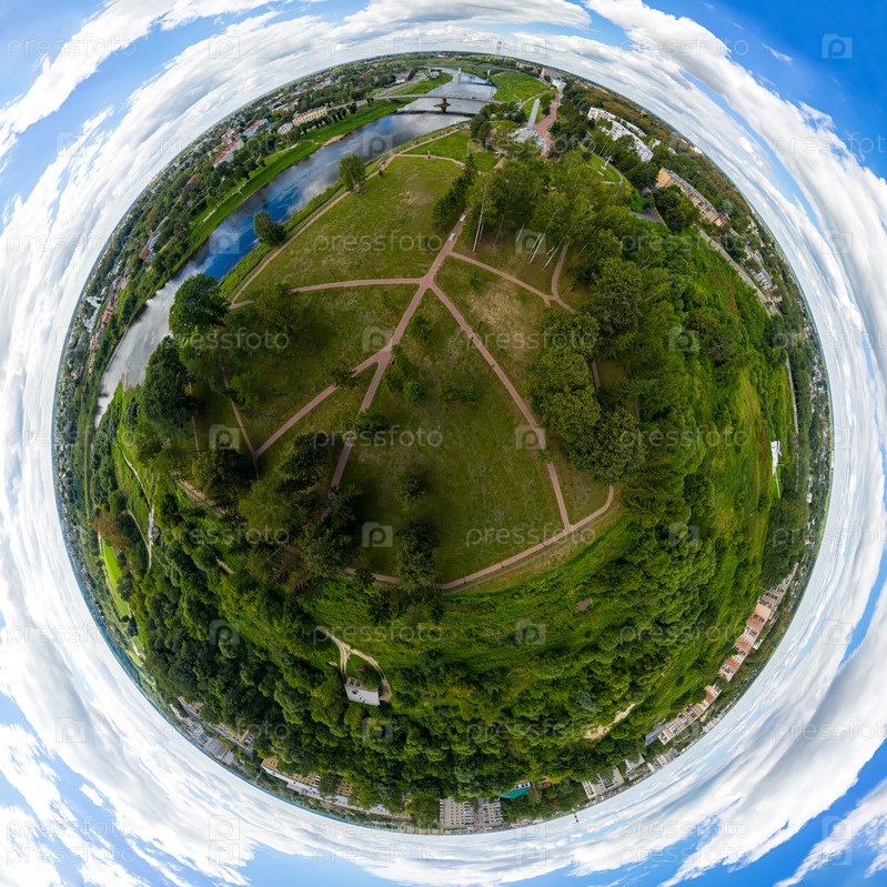 Ржев, Россия. Панорама 360 центра города. Вид с воздуха на Волгу и набережную. 360-градусный панорамный астероид
