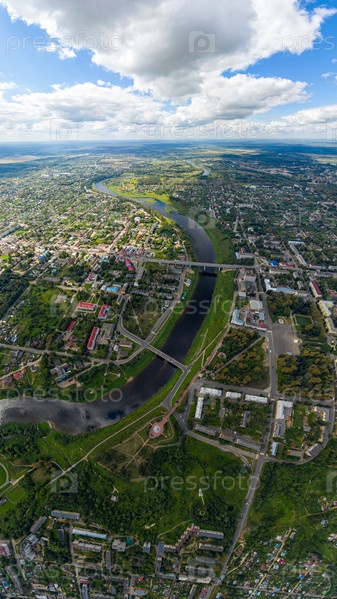 Ржев, Россия. Панорама центра города. Вид с воздуха на Волгу и набережную
