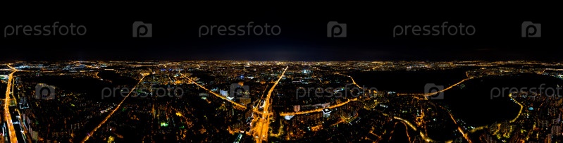 Москва, Россия. Ночная панорама с воздуха. Огни большого города. Панорама 360
