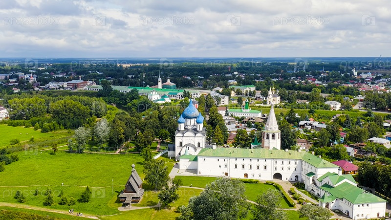 Суздаль, Россия. Полет. Собор Рождества Богородицы в Суздале - православный храм на территории Суздальского кремля, вид с воздуха