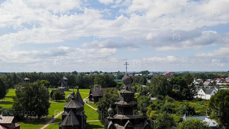 Преображенская церковь из села Козляево, перенесенная в Суздаль - памятник деревянной архитектуры середины XVIII века, вид с воздуха