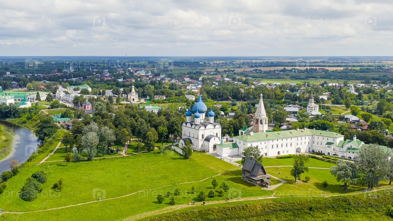 Суздаль, Россия. Полет. Собор Рождества Богородицы в Суздале - православный храм на территории Суздальского кремля, вид с воздуха