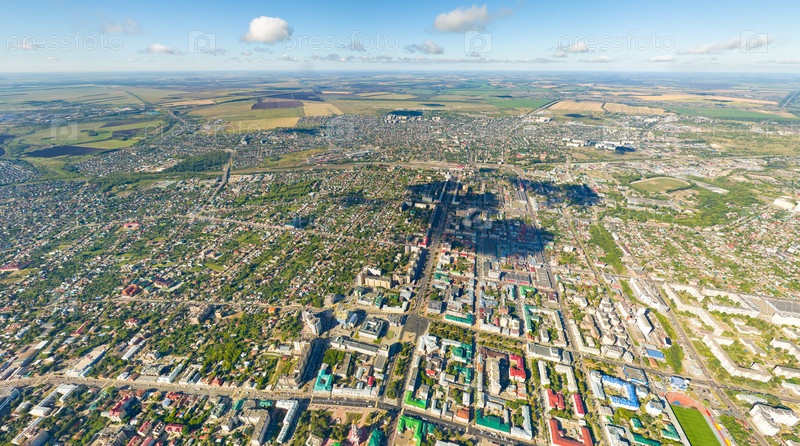 Тамбов, Россия. Панорама города с воздуха летом. Ясная погода с облаками. С высоты птичьего полета