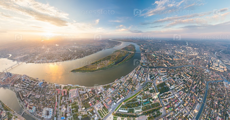 Астрахань, Россия. Панорама города с воздуха летом. Река Волга и остров Городстой. Время заката. С высоты птичьего полета