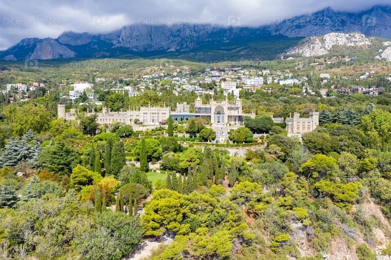 Алупка. Крым. Воронцовский дворец в свете яркого солнца. Лето. С высоты птичьего полета