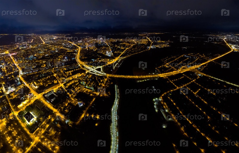 Уфа, Россия. Панорама центра города. Огни ночного города. С высоты птичьего полета
