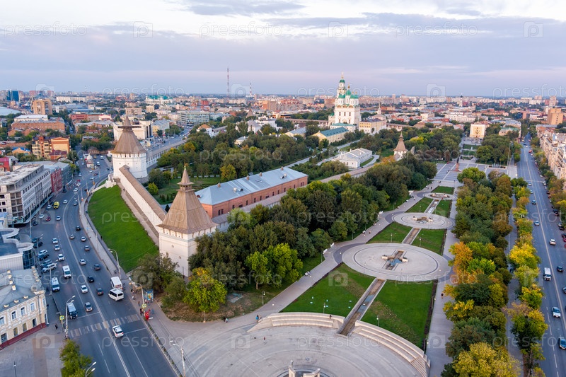 Астрахань, Россия. Астраханский Кремль. Панорама города с воздуха летом. Время заката. С высоты птичьего полета