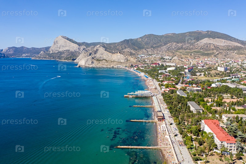 Судак, Крым. Генуэзская крепость. Вид на городские пляжи Судака со стороны Черного моря. С высоты птичьего полета