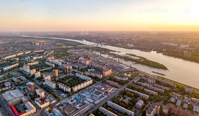 Россия, Омск. Панорама города во время заката. Аэрофотосъемка
