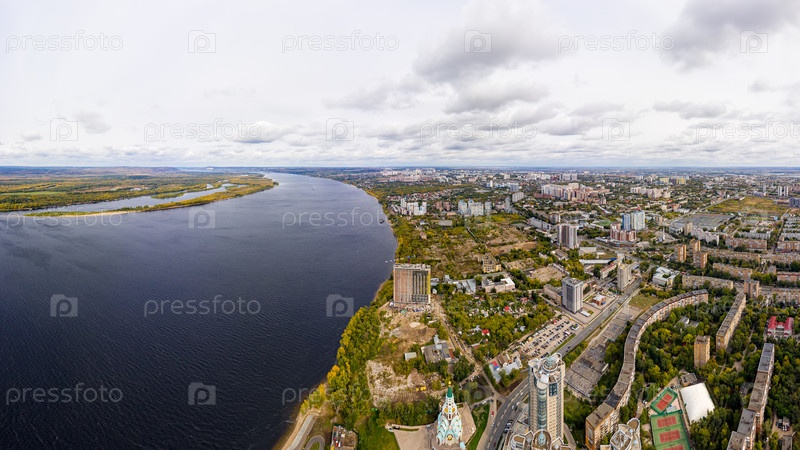 Самара. Россия. Набережная реки Волги с пляжем. Осенний пейзаж. С высоты птичьего полета