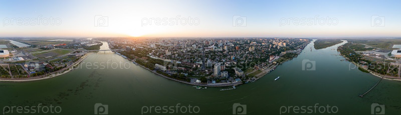 Ростов-на-Дону, Россия. Река Дон. Летняя панорама города с воздуха, вид с воздуха. Закат. Панорама 360