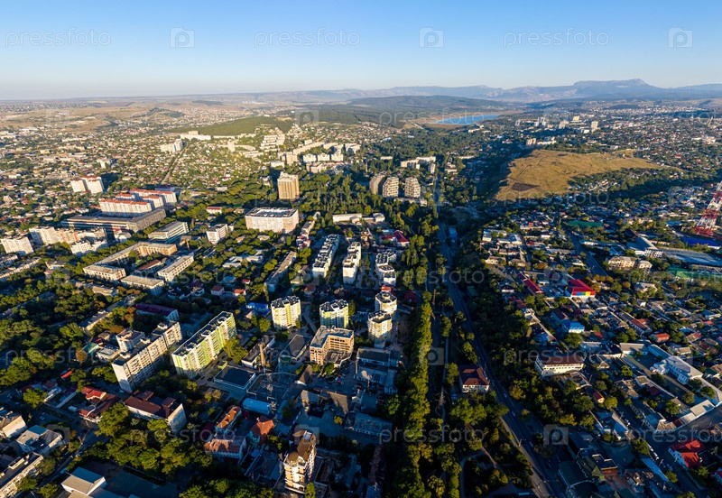 Симферополь, Крым. Город в центре Крымского полуострова, на реке Салгир. Аэрофотоснимок во время заката. Лето