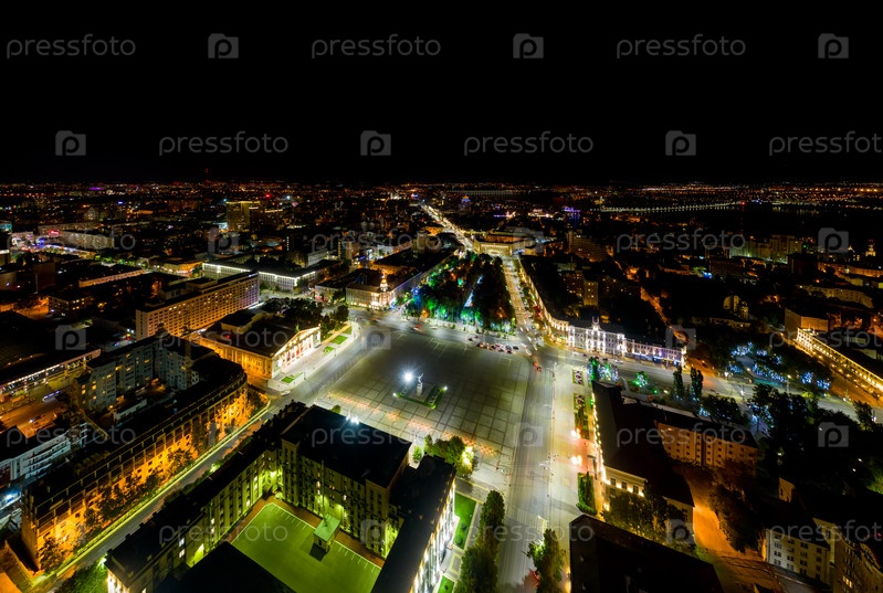 Воронеж, Россия. Площадь Ленина и Кольцовская площадь. Ночная панорама города Воронежа с воздуха. Яркие уличные фонари. С высоты птичьего полета