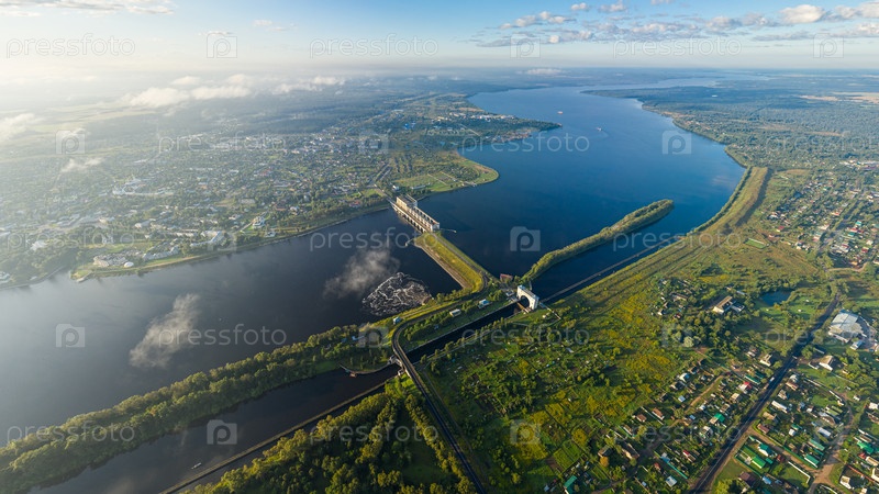 Углич, Россия. Процесс сброса воды из шлюза. Угличский фунтовый замок. река Волга. Угличская ГЭС. Раннее утро. С высоты птичьего полета
