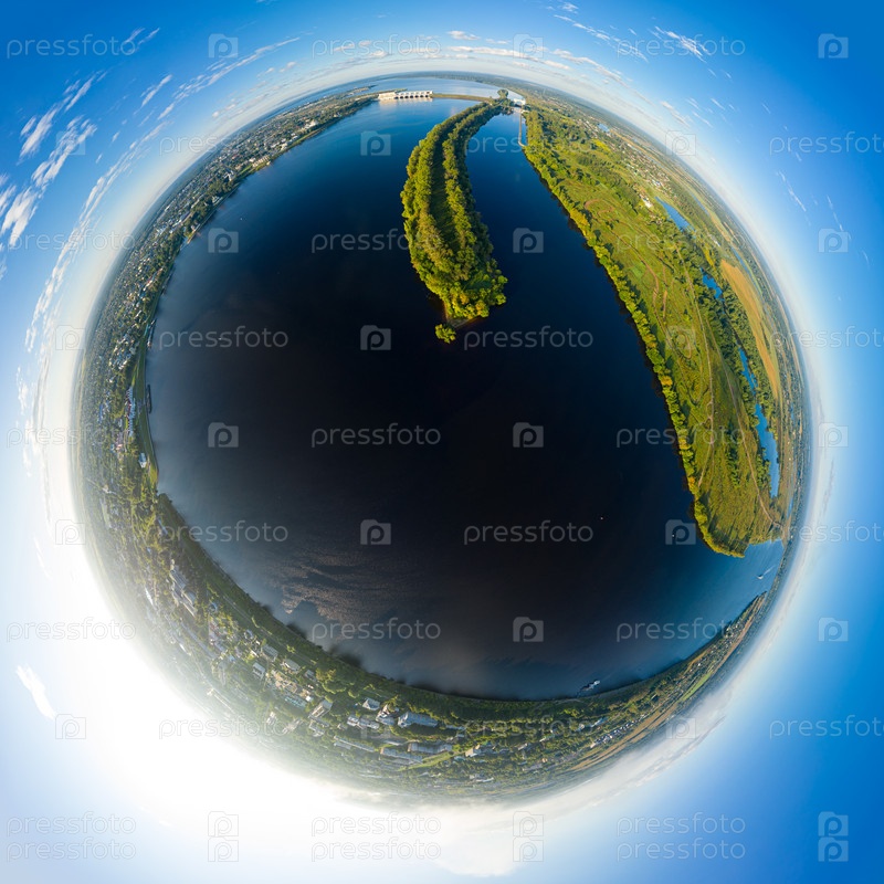 Углич, Россия. Панорама набережной реки Волги, Угличская ГЭС, Шлюз. С высоты птичьего полета. 360-градусный панорамный астероид