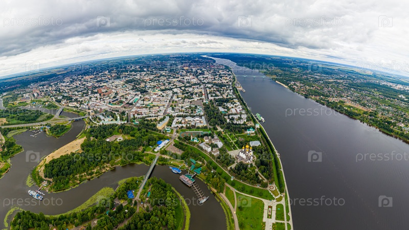 Ярославль, Россия. Парк на Косе (Косе). Панорамный вид на город. Которосль впадает в Волгу. Облачная погода. С высоты птичьего полета