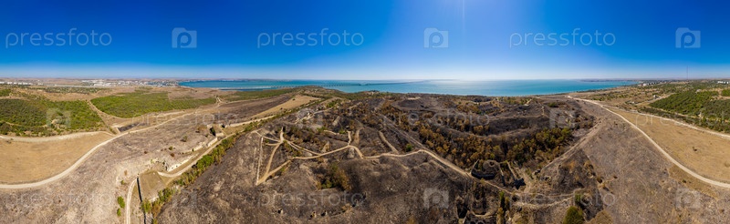 Керчь, Крым. Крепость Керчь - Артиллерийский форт 19 века с тоннелями и подземельями. С видом на Крымский мост. Панорама 360. Вид с воздуха
