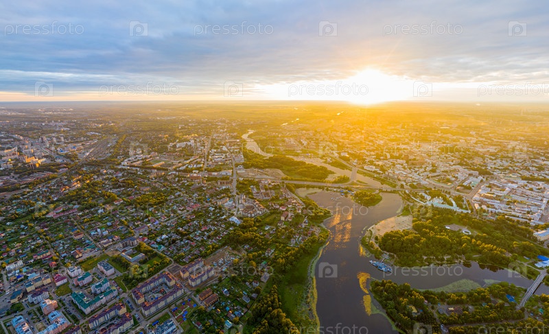 Ярославль, Россия. Исторический центр города Ярославля. Вид с воздуха на закате. река Которосль