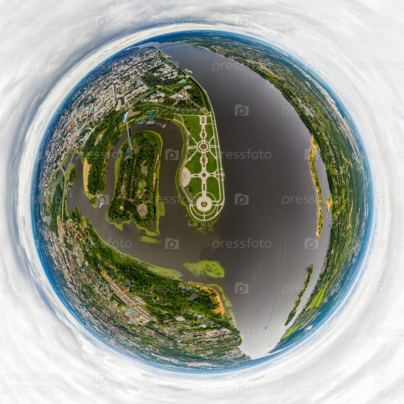 Ярославль, Россия. Парк на Косе (Косе). Панорамный вид на город. Которосль впадает в Волгу. Облачная погода. С высоты птичьего полета. 360-градусный панорамный астероид