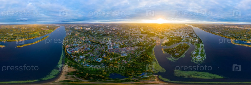 Ярославль, Россия. Парк на Косе (Косе). Панорамный вид на город. Которосль впадает в Волгу. Время заката. С высоты птичьего полета. Панорама 360