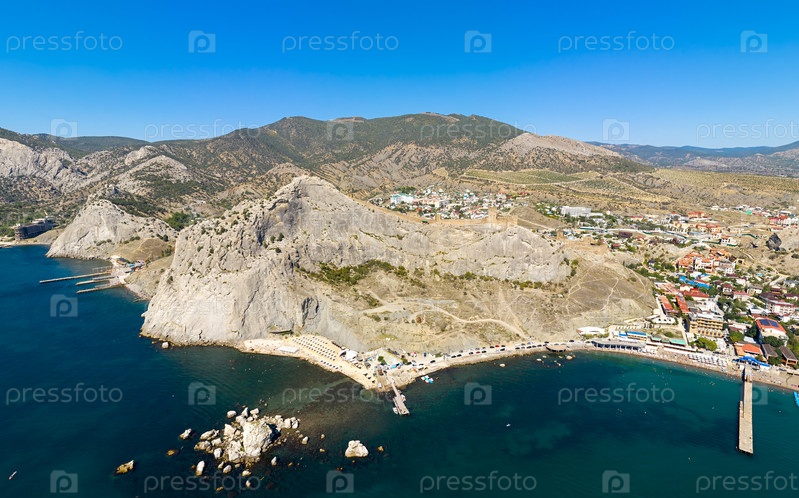 Судак, Крым. Генуэзская крепость. Вид с воздуха с Черного моря. Лето