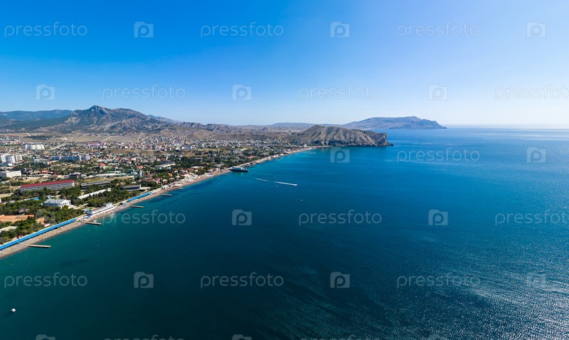 Судак, Крым. Вид на городские пляжи Судака со стороны Черного моря. С высоты птичьего полета
