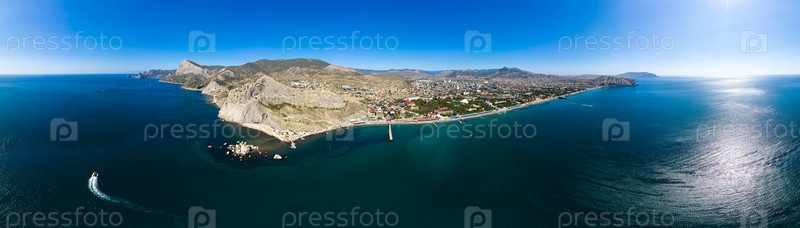 Судак, Крым. Генуэзская крепость. Вид на городские пляжи Судака со стороны Черного моря. Панорама 360. Вид с воздуха