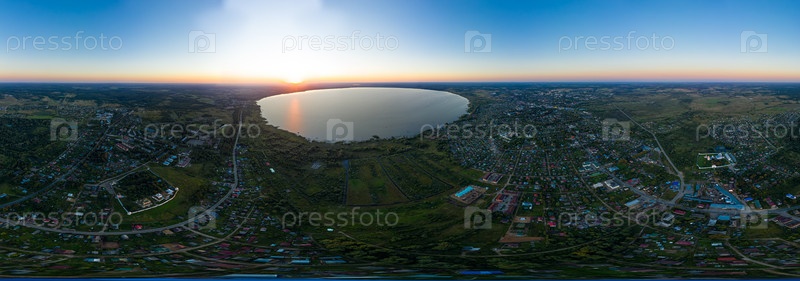Переславль-Залесский, Россия. Плещеево озеро во время заката. Панорама 360. Вид с воздуха